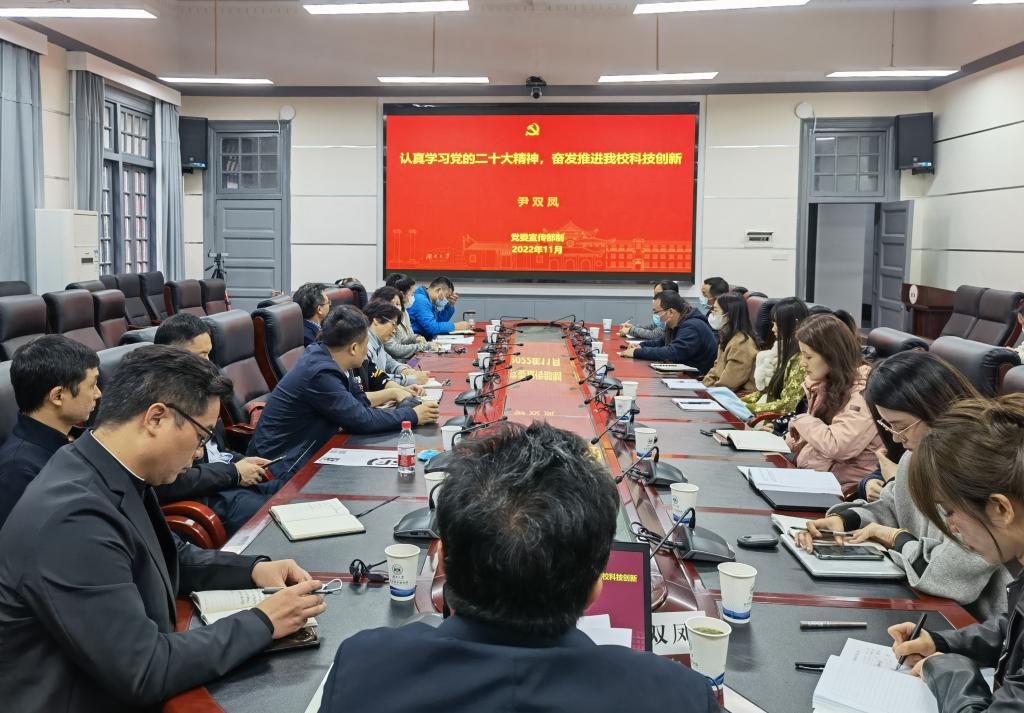 11月16日下午,中国共产党第二十次全国代表大会开幕一月之际,科学技术研究院在校办205会议室组织开展党的二十大精神宣讲会。科研院院长尹双凤教授为全院党员、职工做“认真学习党的二十大精神、奋发推进我校科技创新”专题宣讲。